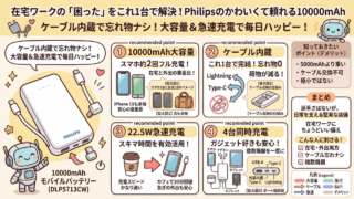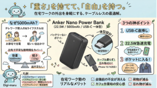 モバイルバッテリー比較|在宅ワークでコンセントを探して下を向く毎日は、もう終わりにしませんか?アンカーやフィリップスなど、性格の全く違う5つの相棒を徹底分析しました。PCを動かすパワーか、カバンが軽くなる自由か。あなたの「働き方の覚悟」に合わせて、最高の一台を一緒に見つけましょう。